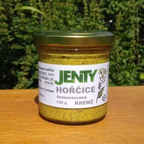 Hořčice, jak ji opravdu neznáte. Fermentovaná. Zraje jako víno. Z počátku drsná až krutá, postupem času jemnější, milejší a zralejší. “Kremžská” je z hořčic od Jenty nejpikantnější a jelikož je vyrobena ze semínek hořčice černé, jejím rozdrcením vznikne známá “kropenatá” barva. Ideální ke klobásce, ovšem fantazii se meze nekladou – do salátu, do pomazánky, pod maso nebo třeba jen tak na chleba. Léčí, kudy pálí. Pro ty, kteří si na pálivé nepotrpí, máme tip. Ochutnejte hořčici až po několika měsících, o svou palčivost zráním přijde a Vy si bez úhony vychutnáte její jedinečnou chuť.