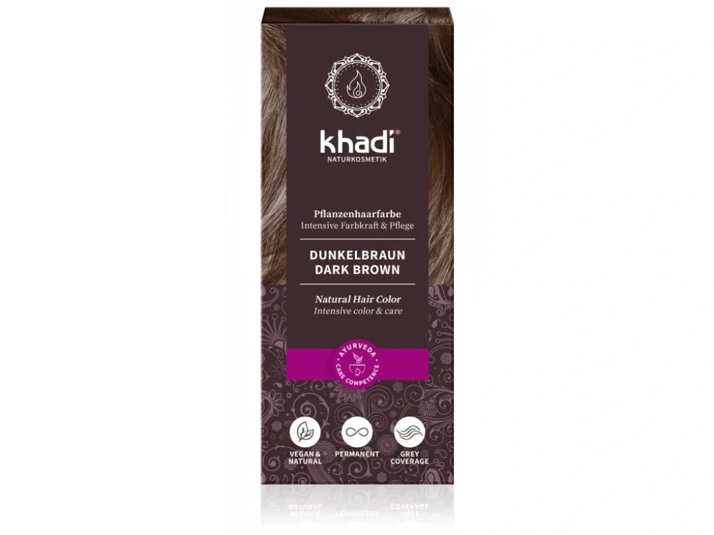 Khadi vlasová barva TMAVĚ HNĚDÁ je absolutně přírodní barva na vlasy, bez chemických přísad, konzervačních látek a umělých barviv.