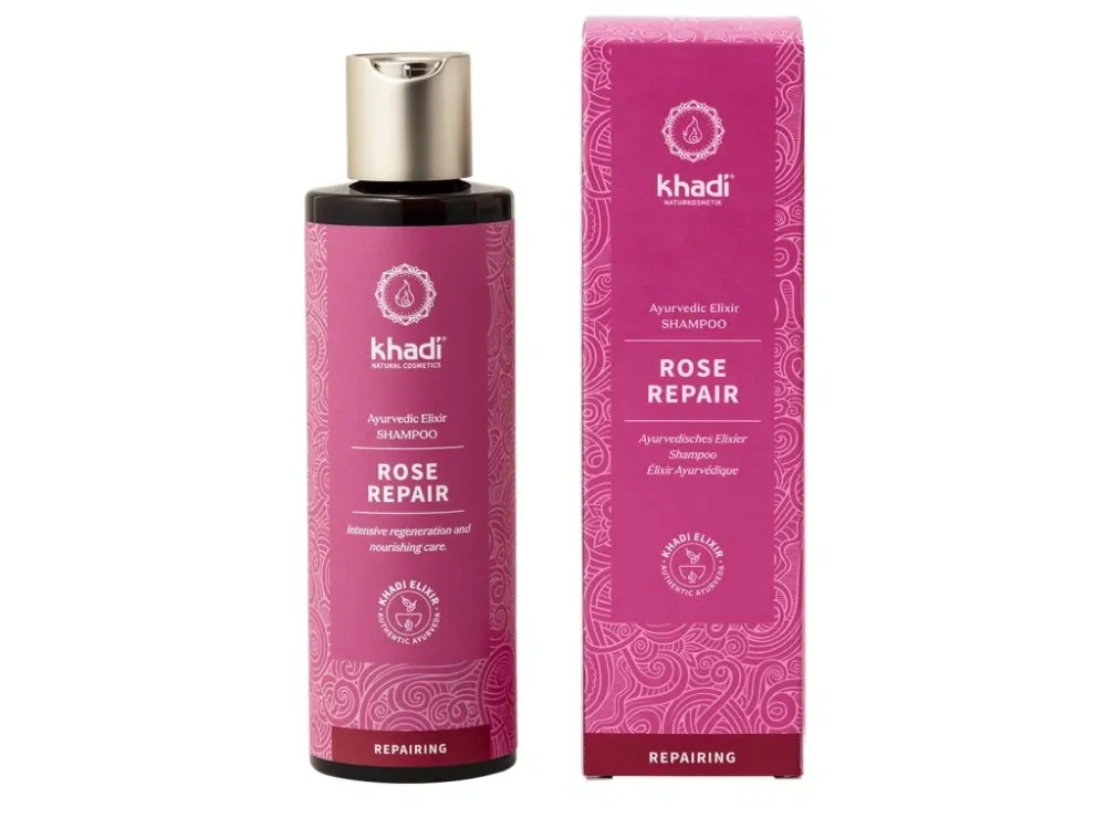 Khadi elixír šampón Růže Reparace reparuje vlasovou strukturu a navrací vlasům elasticitu a přirozené zdraví. Tajemství regeneračního účinku spočívá v Khadi elixíru Růže Reparace. Tato kompozice ajurvédsky vyrobených rostlinných extraktů, sestavená podle ajurvédských principů, umocňuje účinky jednotlivých indických rostlin do synergického celku. Khadi elixír Růže Reparace je vyráběn pomocí prastarých, časově náročných ajurvédských postupů nad otevřeným ohněm.