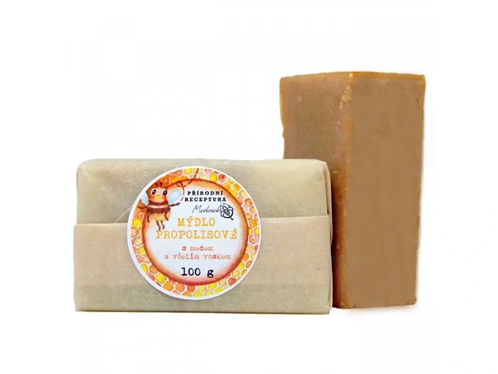 Přírodní mýdlo se základem z kokosového, olivového oleje a bambuckého másla obohacené o včelí vosk, med a naši propolisovou tinkturu. Mýdlo má díky propolisu jemně dezinfekční účinky, med a vosk zase pečuje o kůži. Mýdlo doporučujeme např. pro mytí rukou po pobytu venku, hodí se však i na hygienu těla. Mýdlo může pomoci při péči o kůži s kožními obtížemi.